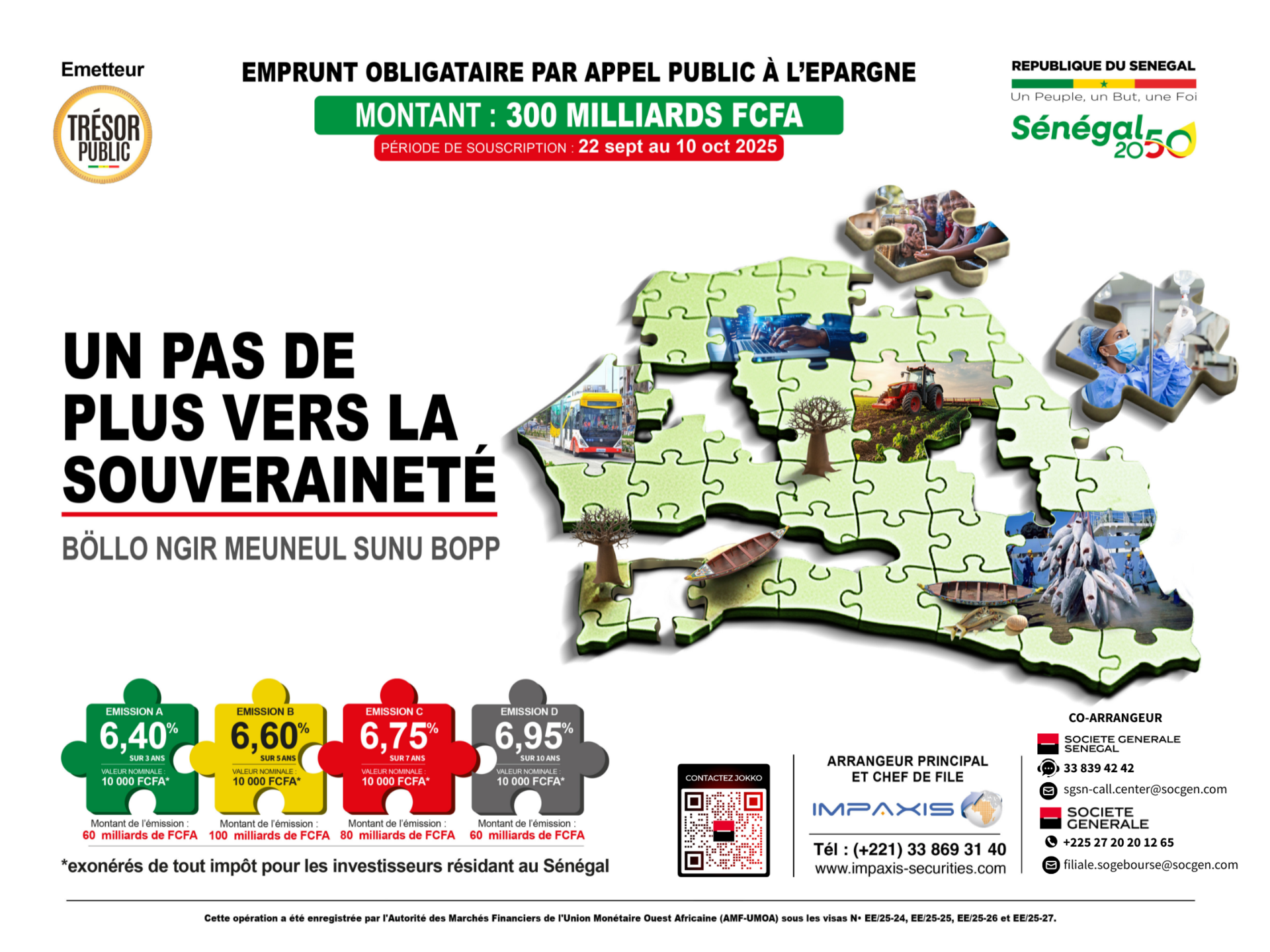 Dans le cadre du financement des projets inscrits au budget 2025 et du plan stratégique Sénégal Horizon 2050, L’Etat du Sénégal lance du 22/09 au 10/10 une nouvelle émission d’emprunt obligataire par appel public à l’épargne multi-tranches d’un montant total de 300 milliards FCFA, ouvert à tous : citoyens résidents, membres de la diaspora, et investisseurs.