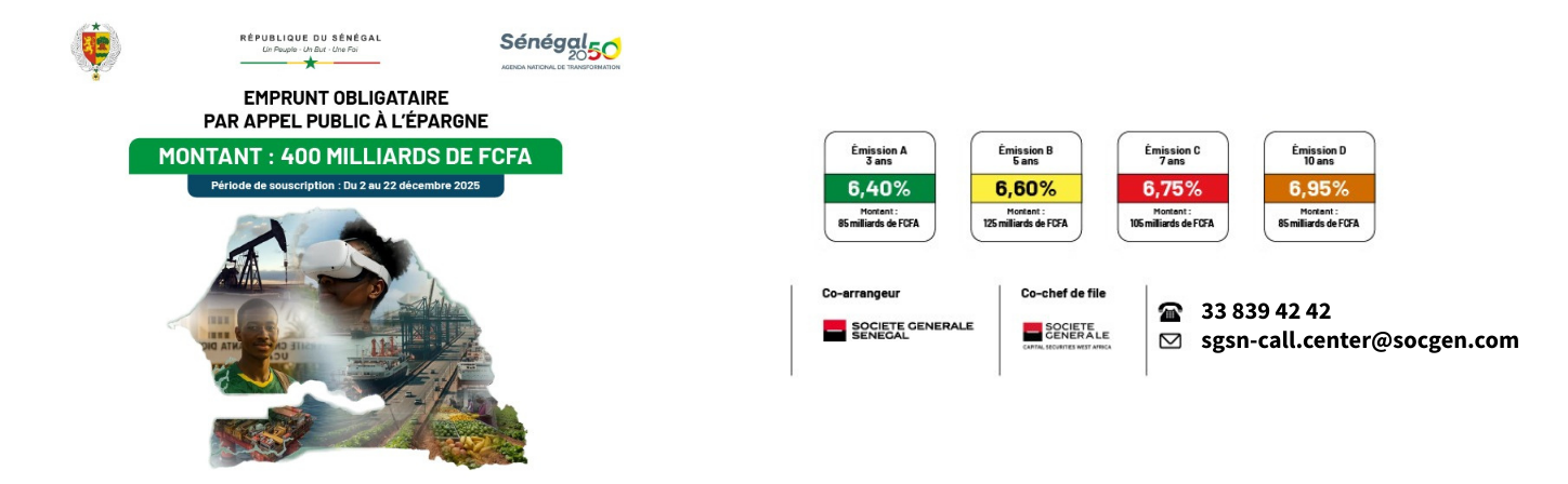 Dans le cadre du financement des projets inscrits au budget 2025 et du Plan stratégique Sénégal Horizon 2050, l’État du Sénégal annonce une nouvelle émission d’emprunt obligataire par appel public à l’épargne multi-tranches, d’un montant total de 400 milliards FCFA. Cette opération se déroule du 02 au 22 décembre 2025 et est ouverte à tous : citoyens résidents, membres de la diaspora et investisseurs institutionnels.